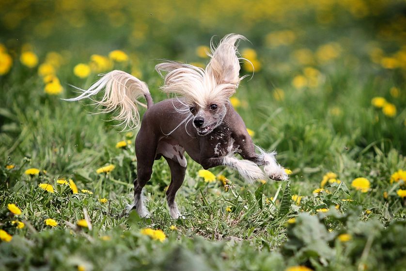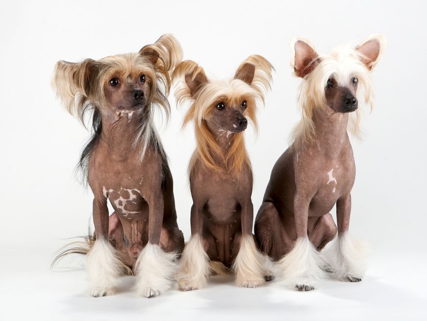 This small dog breed might be one of the most recognizable of them all. The Chinese crested stands about 11-12 inches high and weighs 10-13 pounds. And, you probably noticed it is mostly naked. Many individuals of the breed are hairless except for a crest of fur on their heads, "socks" on their feet, and a plume of fur on their tails. However, there is a recessive gene in some dogs that cause them to have (gasp!) a full coat of fur. These are known as "powder puffs."