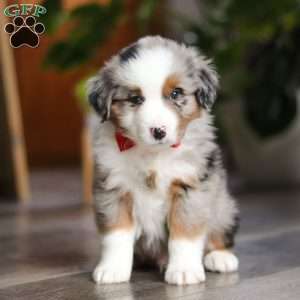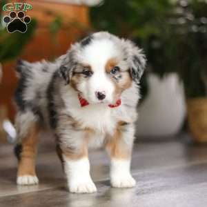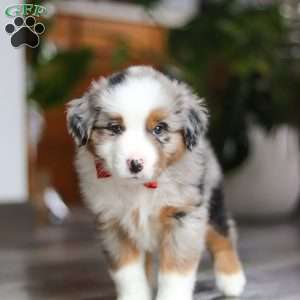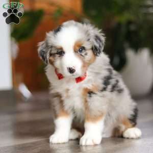 Hi, I’m Ghirardelli, a sweet and playful AKC Miniature Australian Shepherd with a heart full of love and a tail that never stops wagging! I’m curious, energetic, and always ready for an adventure, whether it’s exploring new places or snuggling up for some cozy cuddle time. With my soft, fluffy coat and bright, sparkling eyes, I love making new friends wherever I go. Chasing a ball, learning new tricks, or just hanging out with my favorite humans—those are my happiest moments, filled with joy and affection every single day.